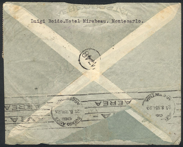 Registered air mail cover sent to Argentina on 8/AP/1931, with interesting postage, 2 official seals and a number of postmarks, excellent! (Image)
