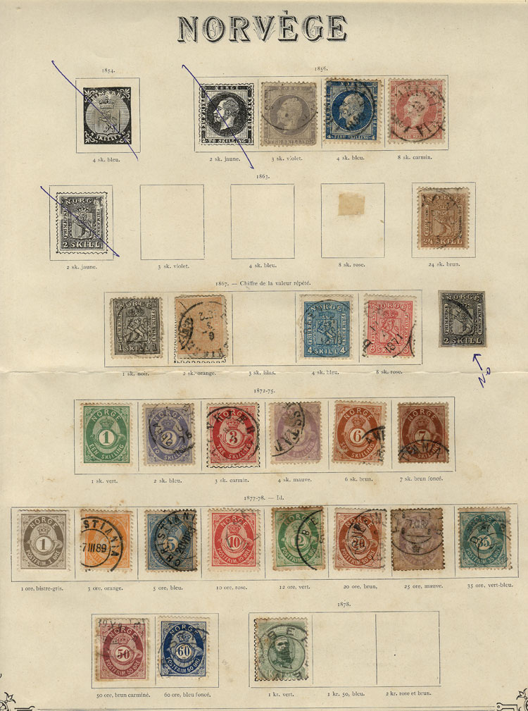 Collection in very old album pages, including scarce and interesting stamps and it may also include color varieties and rare postmarks, mixed quality from very fine to stamps with defects, Scott catalog value US$1,200+, good opportunity