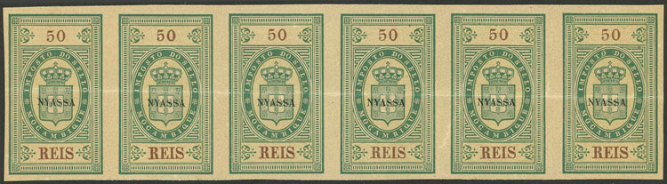 of 6 of old 50Rs. revenue stamp of Mozambique overprinted NYASSA, MNH, with a horizontal crease else VF quality! (Image)