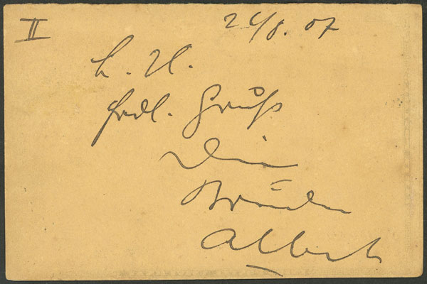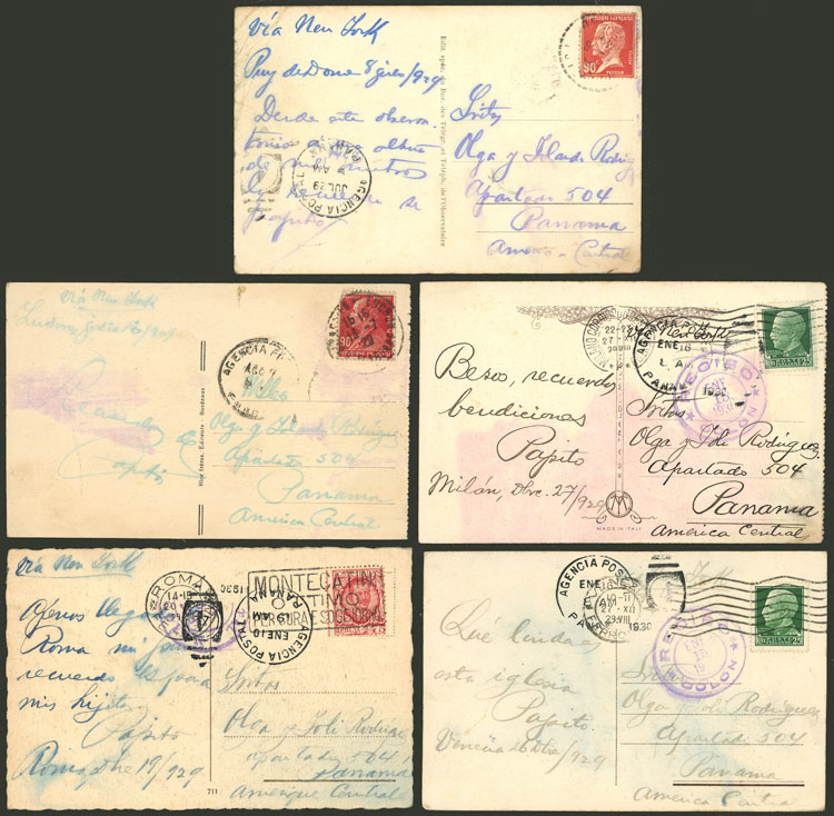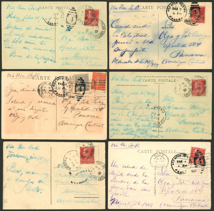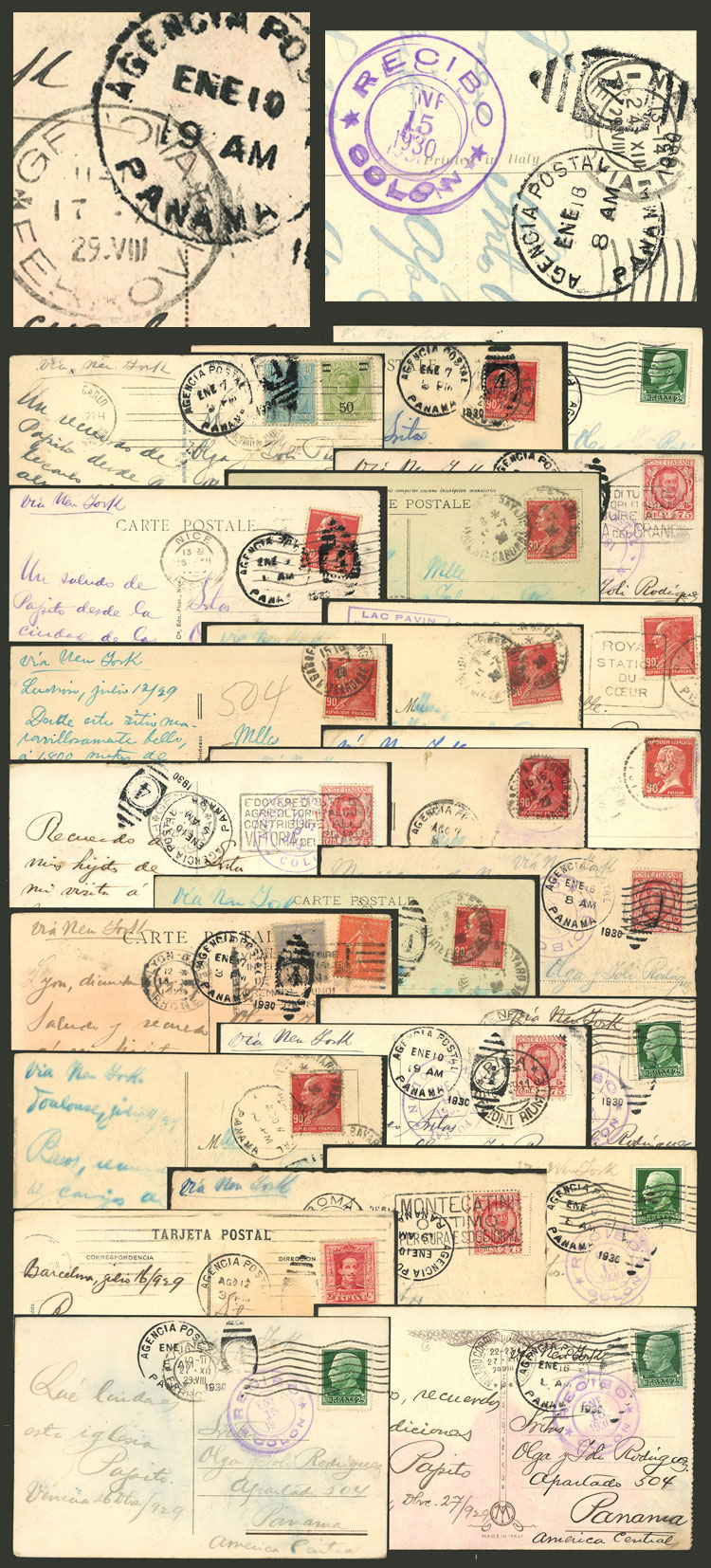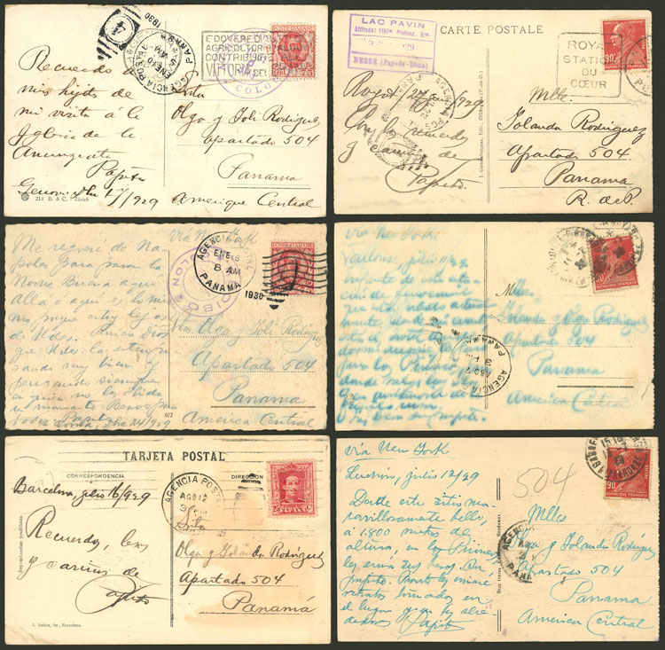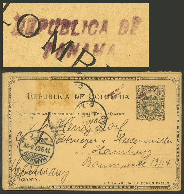 Postal card of Colombia of 2c. with 2 violet overprints "REPUBLICA DE PANAMA" sent from Cristobal to Germany on 27/AU/1907, with arrival mark of Hamburg 14/SE. It had a stamp affixed as additional postage, unfortunately now missing,