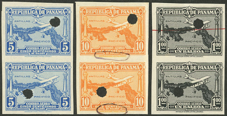 10 + 11 + 14, 1930 Airplane and map, 3 values of the set, PROOFS in the original colors, imperforate pairs with punch hole, very fine quality, rare lot! (Image)