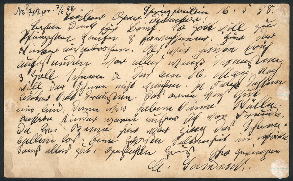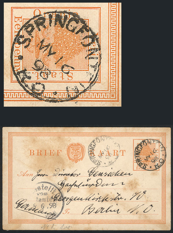Postal card sent from SPRINGFONTAIN to Berlin on 16/MAY/1898, with some stain spots else excellent, very interesting! (Image) (Image-02)
