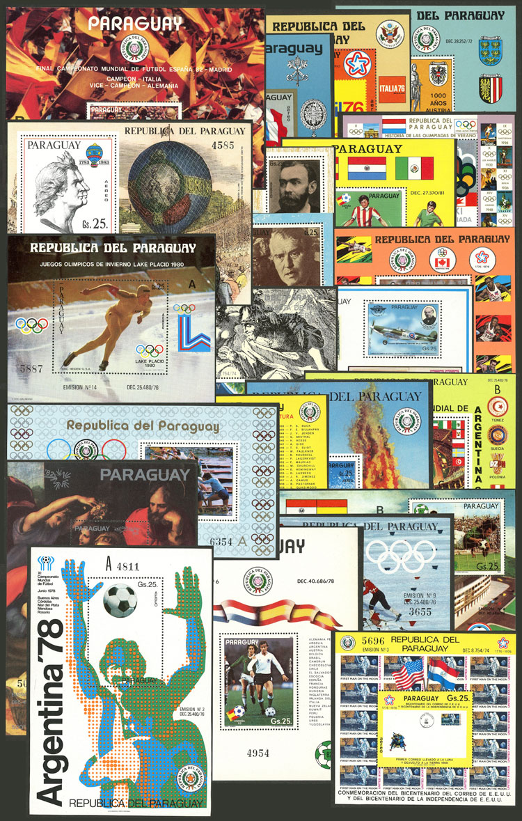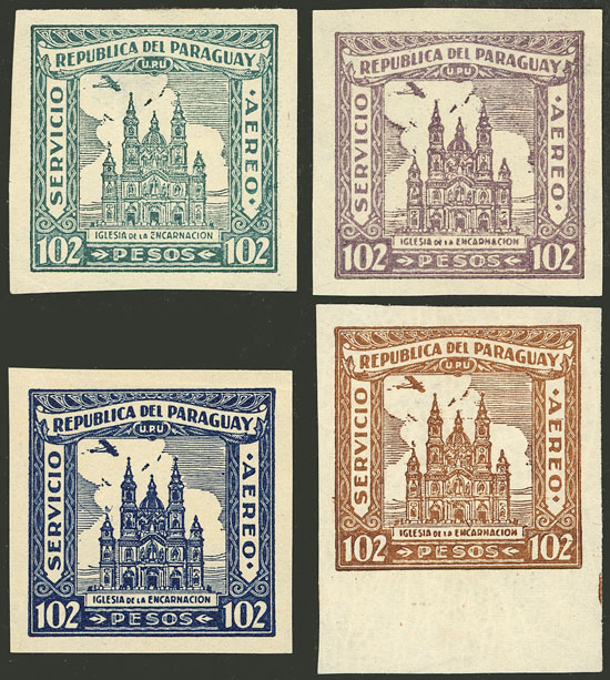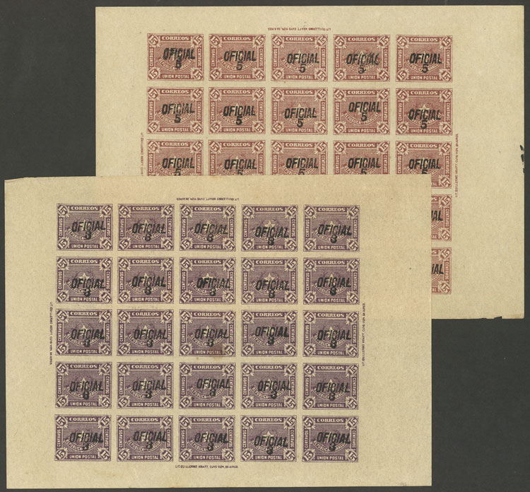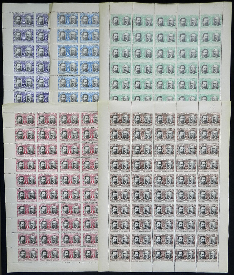 Sc.O99/O103, 1940 University of Asunción, complete sheets of 50 stamps of each one of the first 5 values, with varieties: horizontally or vertically IMPERFORATE. Each sheet contains 25 IMPERFORATE pairs, MNH, with some minor defect of