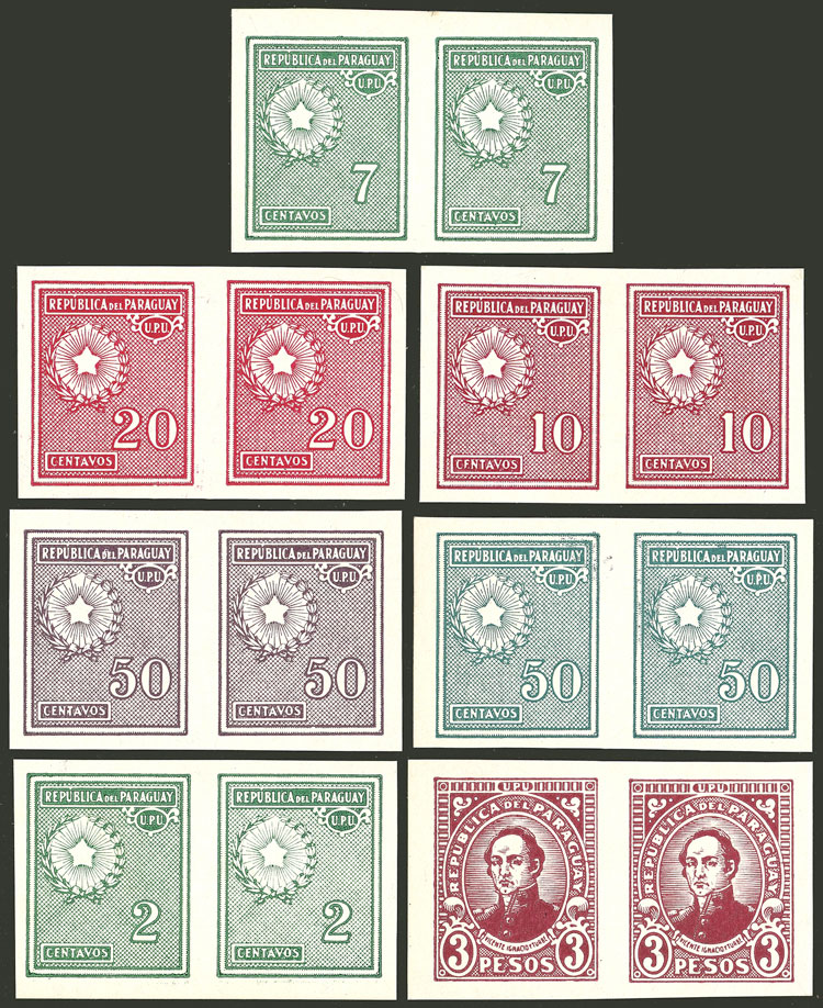 266 + other values, 1927/9 proofs printed on glazed card stock, 7 different imperforate pairs, excellent quality! (Image)