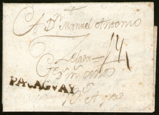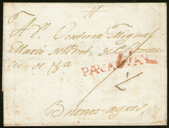 cover sent from Asunción to Buenos Aires (circa 1806) with straightline red "PARAGUAY" mark very well applied, very fine quality, rare! (Image)