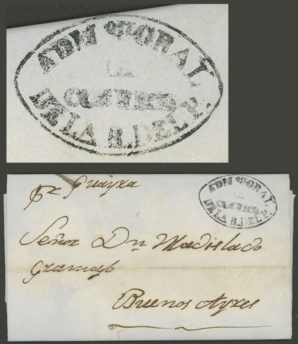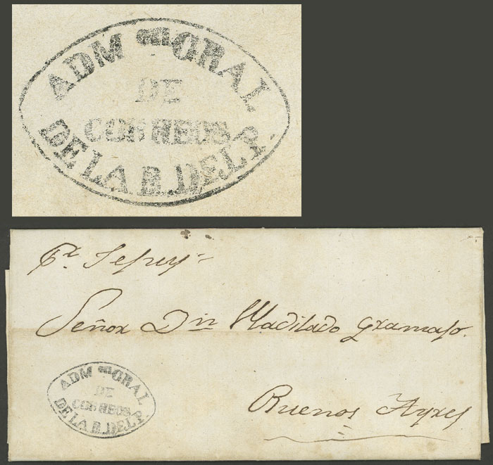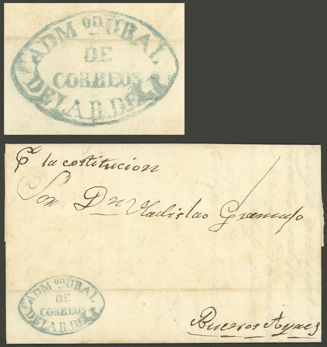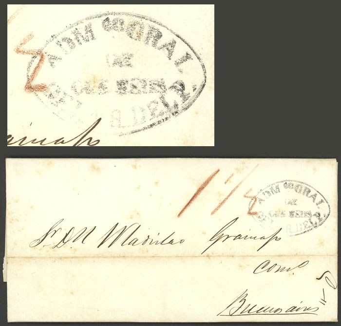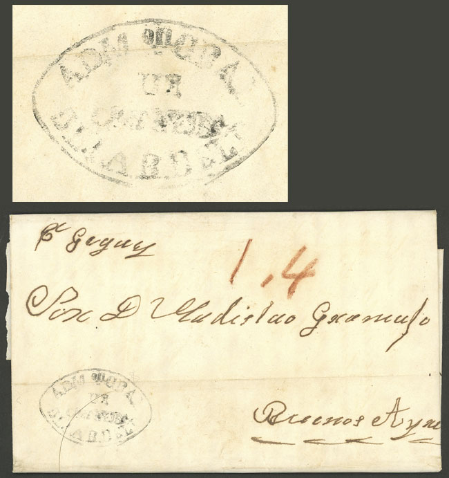 letter dated Asunción 13/MAY/1860 sent to Buenos Aires (by Gejuy), with black mark "ADMON. GRAL. DE CORREOS DE LA R. DEL P." and "1,4" rating (1¼ Reales) in red pencil, excellent quality. The text is interesting, it includes comments about the lack