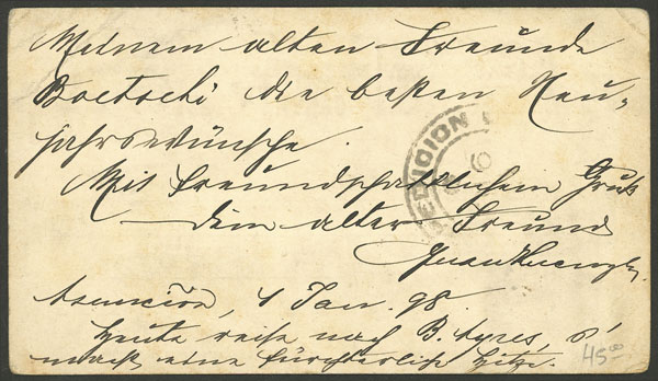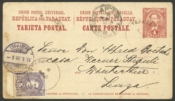 2/JA/1898 Asunción - Switzerland, 4c. postal card uprated with 5c. (total 9c.) sent to Winterthur, with attractive "ESTAFETA" cancels (dispatching) + Buenos Aires transit of 7/JA, and arrival backstamp, very interesting! (Image) (Image-02)