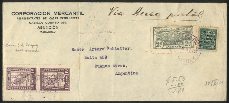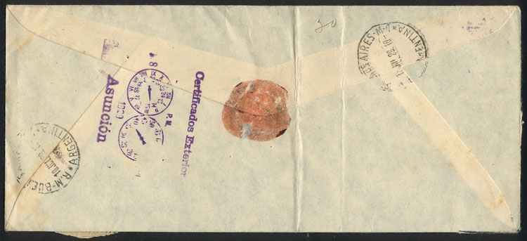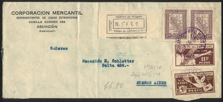 Registered airmail cover (commercial) sent from Asunción to Buenos Aires on 7/JUL/1929 with nice postage of 19.95P.! (Image) (Image-02)