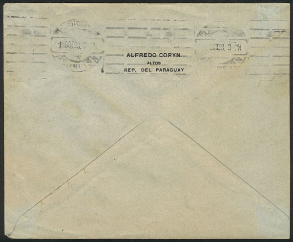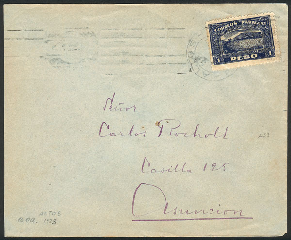 Cover sent from ALTOS to Asunción on 10/OC/1923 franked with 1P., VF quality! (Image) (Image-02)