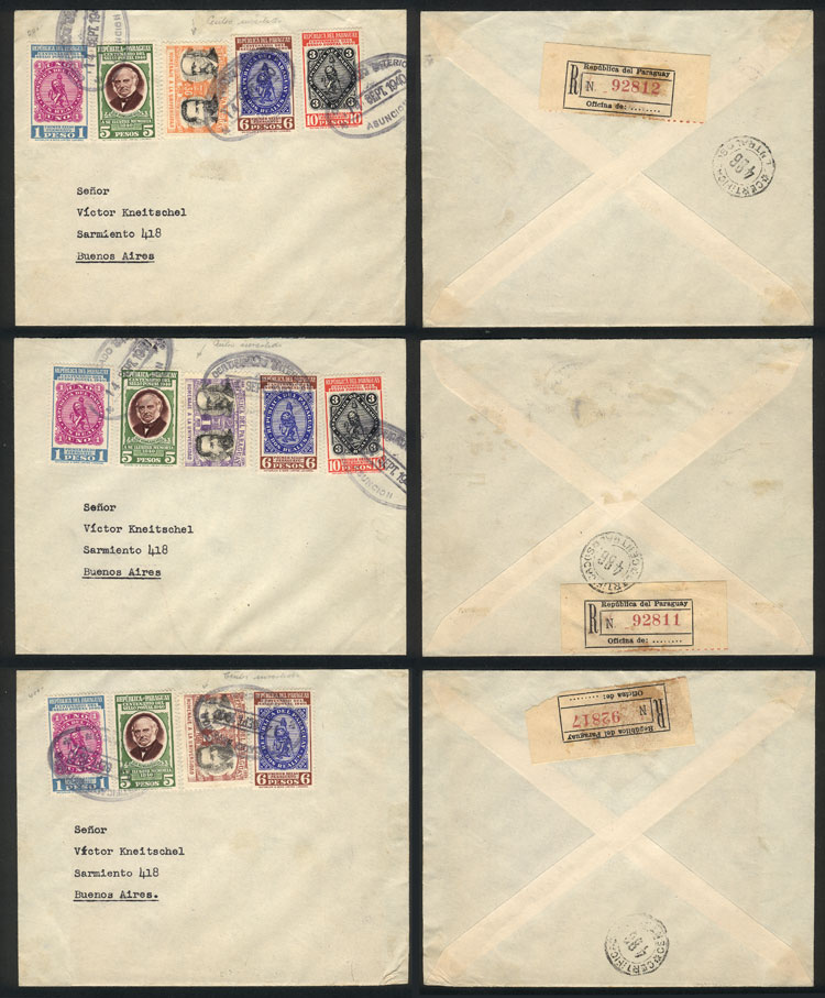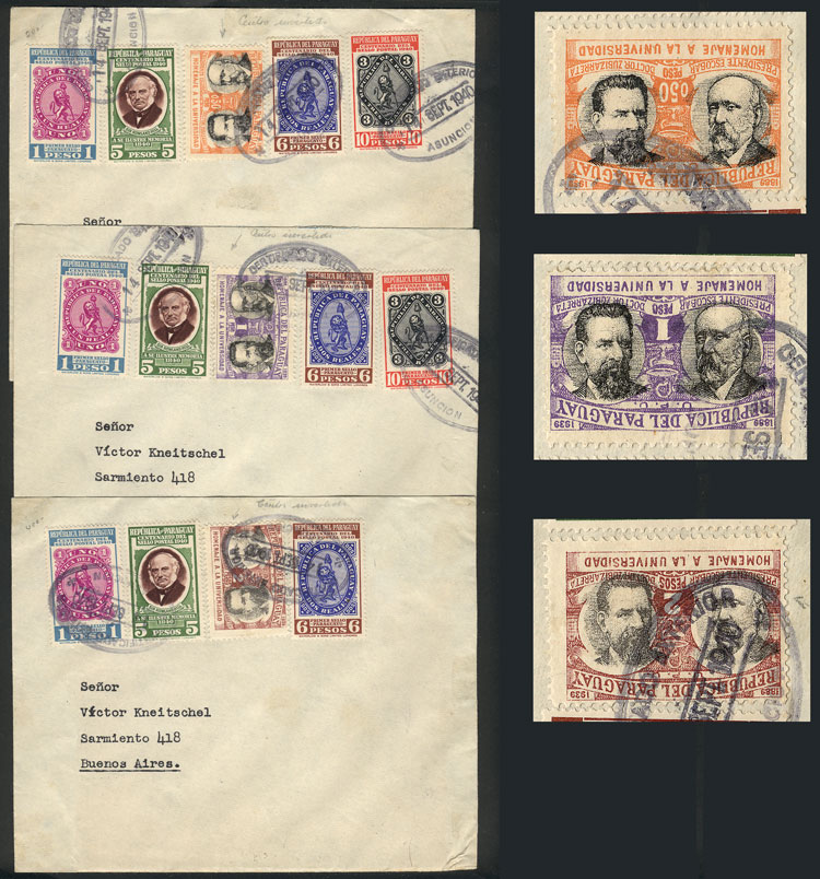 Sc.351/353, with INVERTED CENTERS (University of Asunción), franking along other values 3 covers sent to Buenos Aires in SE/1940, excellent quality, extremely rare, very few known!! (Image) (Image-02)