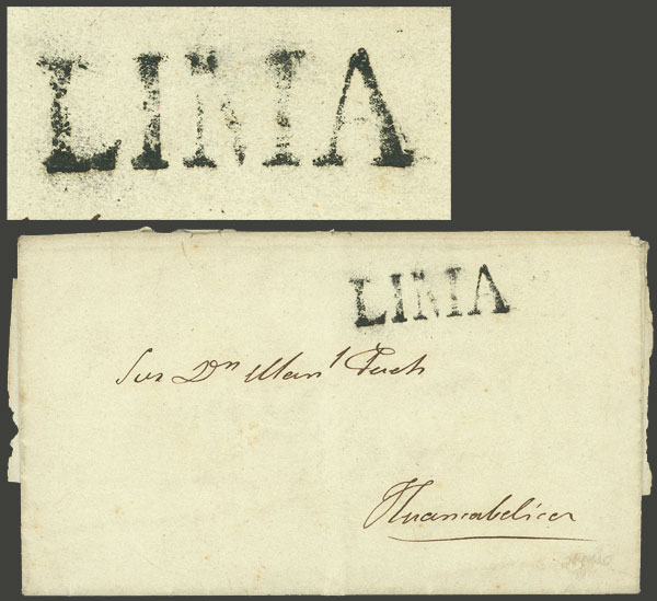 letter sent to Huancavelica on 27/MAY/1838 with the mark LIMA (34 x 11 mm) very well applied! (Image)