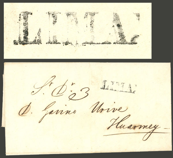letter dated 23/AU/1848 and sent to Huarnay, with "3" rating and the mark LIMA in hollow serif letters (30 x 8 mm), excellent quality! (Image)