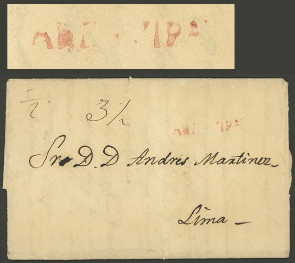 letter dated 4/FE/1839 and sent to Lima, with "3½" rating in pen and red AREQUIPA mark (33.5 x 5 mm), with long and interesting text, VF quality! (Image)