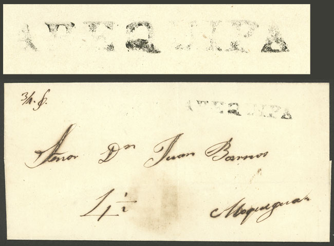 cover sent to Ayacucho with straightline AREQUIPA mark (54 x 7 mm) in black along "4½" rating, VF quality! (Image)