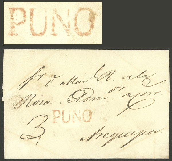 cover sent to Arequipa with "3" rating and red PUNO mark (28 x 8 mm) perfectly applied, excellent quality! (Image)