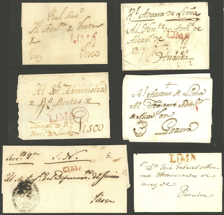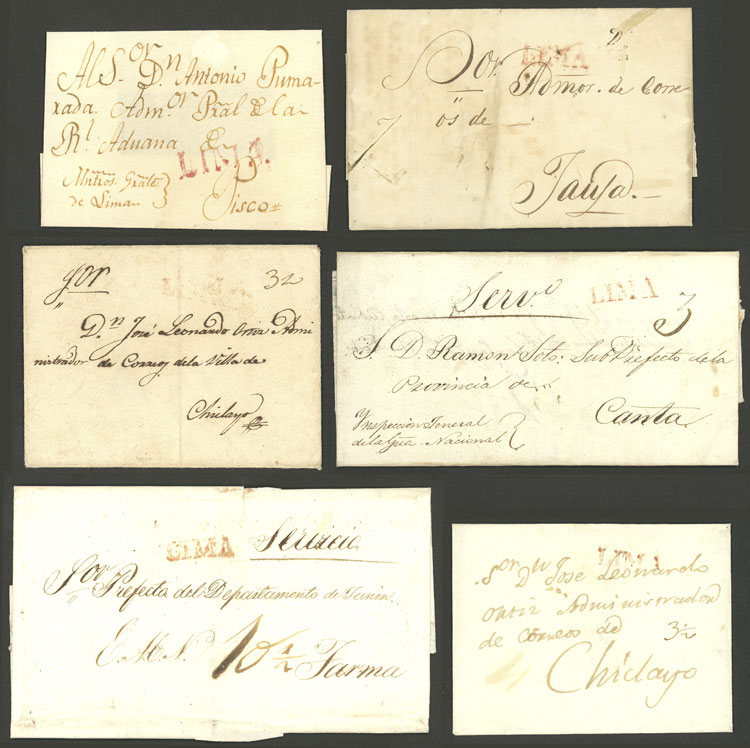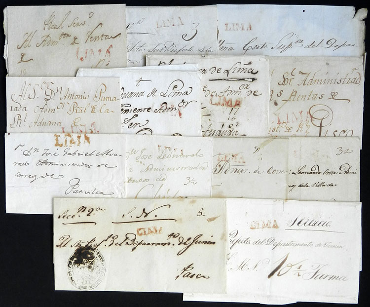 13 Very old folded covers with "LIMA" marks in red (some different), varied ratings and destinations, very fine quality, interesting group, low start!