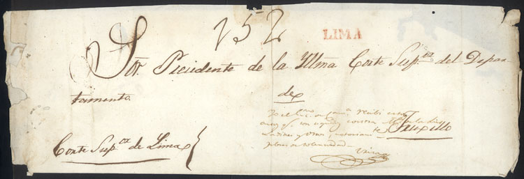 Large official folded cover dated 14/MAR/1834 sent to Trujillo, with large "82" rating along red "PIURA" mark, interesting! (Image) (Image-02)