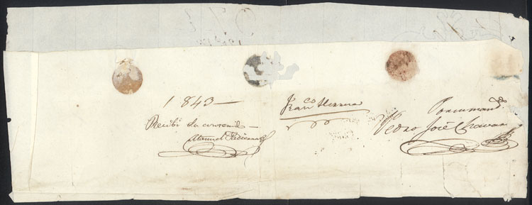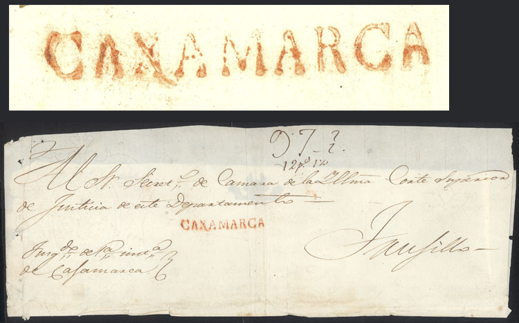 Large folded cover dated 1843 and sent to Trujillo, with hugh "97½" rating along red "CAXAMARCA" (51 x 6 mm) very well applied, VF quality!