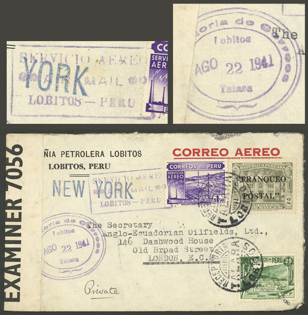 22/AU/1941 Lobitos - England, airmail cover franked with 3.75S., with the rare cancel "RECEPTORIA LOBITOS - TALARA" in black, along oval datestamp of Lobitos in violet, also rectangular "SERVICIO AEREO - AIR MAIL - LOBITOS-PERU", with