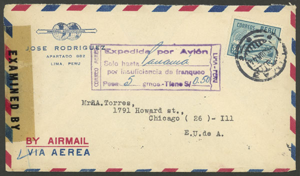 6/JUN/1944 Lima - USA, airmail cover franked with 50c., with violet rectangular mark indicating that the letter would be flown ONLY UP TO PANAMA due to insufficient postage, VF! (Image) (Image-02)