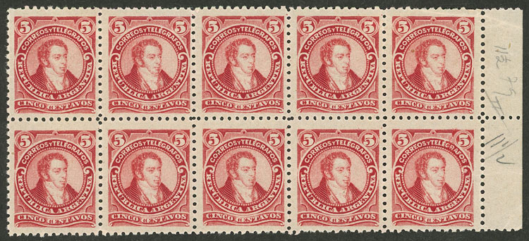 1889 5c. Rivadavia type II (small head), block of 10 stamps with sheet margin, almost all MNH (+50%), excellent! (Image)