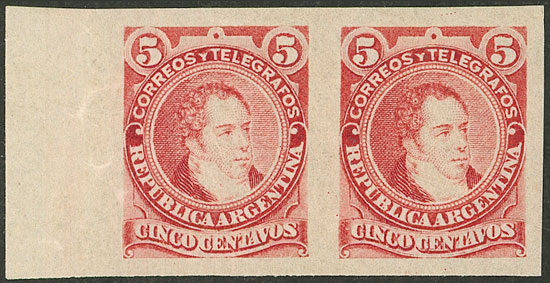1889 5c. Rivadavia type I (large head), IMPERFORATE PAIR, mint with tiny hinge mark, VF quality! (Image)