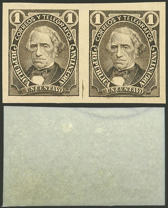 1889 1c. Vélez Sársfield, IMPERFORATE PAIR with Globes watermark, only known without gum (this one is unmounted, it was never hinged), excellent and rare! (Image)