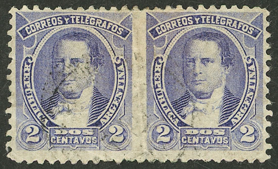 1889 Derqui 2c. bluish lilac, horizontal PAIR IMPERFORATE BETWEEN, used (rarer than mint!), VF quality! (Image)