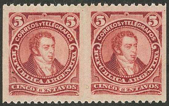 1889 5c. Rivadavia type II (small head), PAIR IMPERFORATE VERTICALLY, mint lightly hinged, VF quality! (Image)