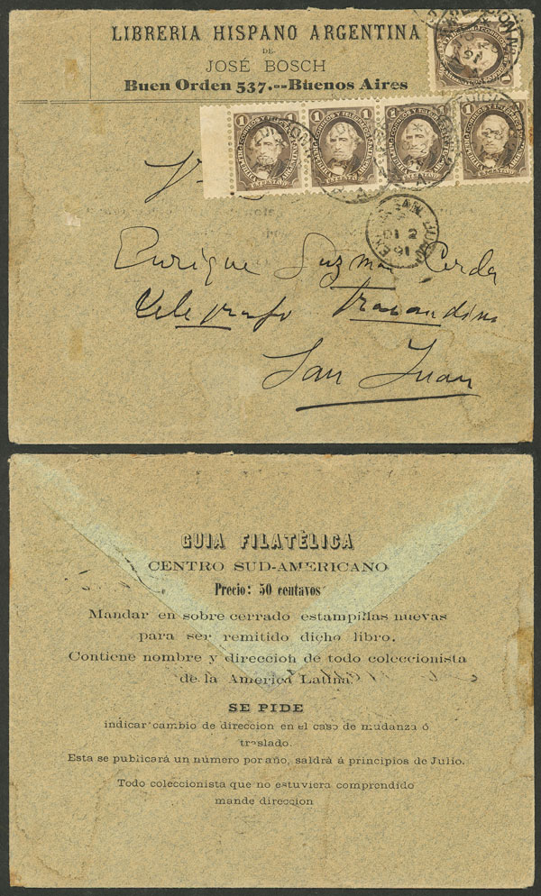 with very attractive advertising on front and back ("Librería Hispano-Argentina, Guía Filatélica Centro-Sud Americano"), franked with 5c. (GJ.101 x5) and sent from B.Aires to San Juan on 26/NO/1891, VF quality! (Image)