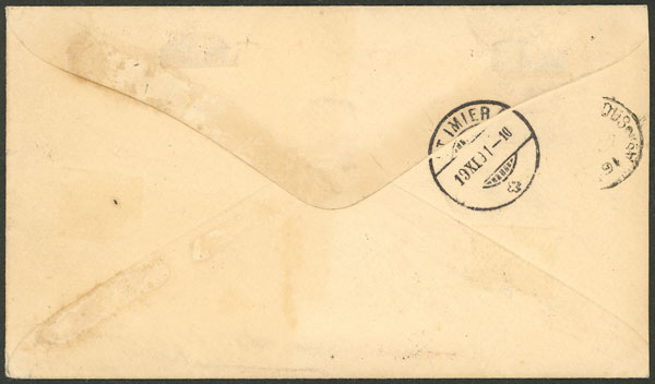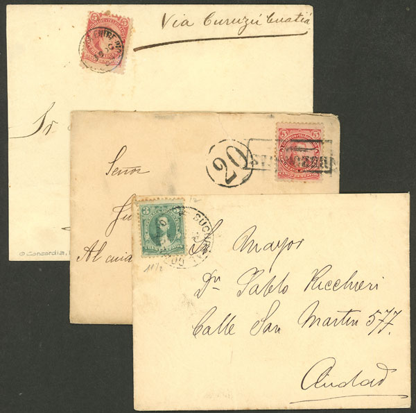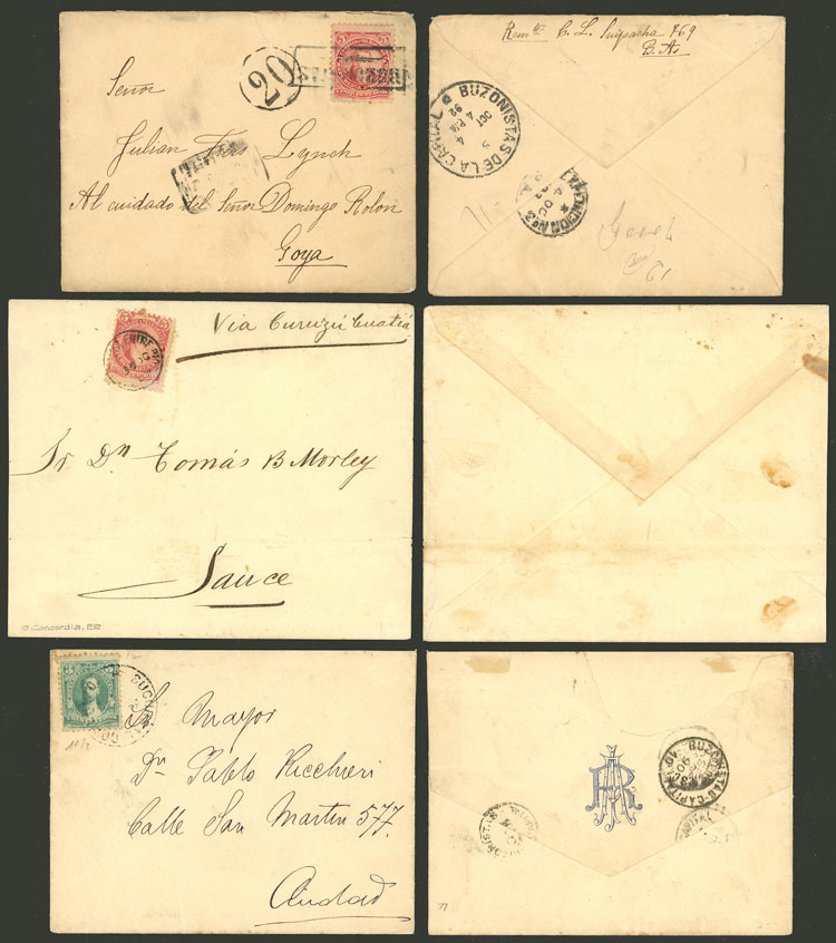 stamps of 12c. Alberdi and 1P. San Martín (top one) fell off in the past and similar examples have been affixed, only to show the original franking. Very few covers franked by the 5P. Lamadrid are known, great rarity!! (Image)