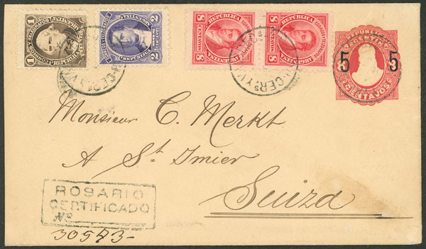 GJ.109 pair + 101 + 102 on a 5c. stationery envelope sent by registered mail with AR from Rosario to Switzerland in OC/1891, excellent quality! The 24c. postage paid the international basic rate (8c.) + registration (10c.) + AR (6c.) (Image) (Image-02)