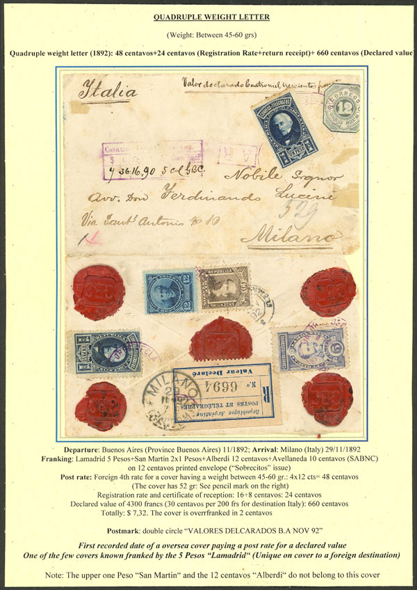 12c. - VK 5) sent in November 1892 from Buenos Aires to Milano, with a declared value of 4300 Francs, franked with 7.32 Pesos, with 10c. Avellaneda (GJ.110), 12c. Alberdi (GJ.129), 2x 1 peso San Martín (GJ.115) and 5 pesos Lamadrid (GJ.116). The