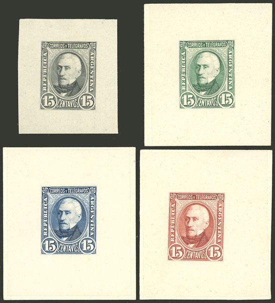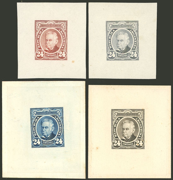 Vicente López (unissued), 4 DIE ESSAYS, SECOND STAGE (second "4" retouched), different colors, 2 printed on thin paper affixed to a card and other 2 on thin paper, VF quality