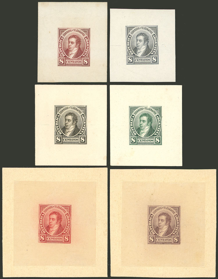 8c. Rivadavia, 6 DIE PROOFS printed on thin paper (4 are affixed to card), different colors, excellent quality! (Image)