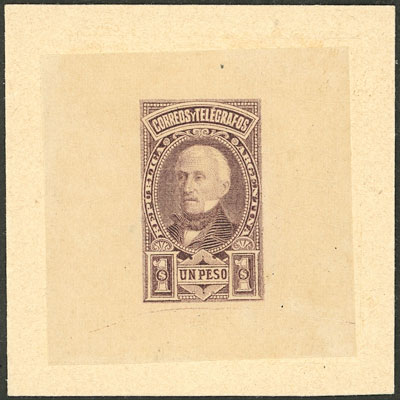 1P. San Martín, DIE PROOF in lilac, thin paper affixed to card, VF quality (Image)