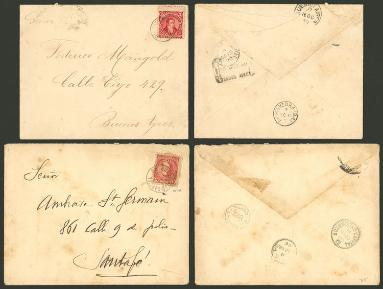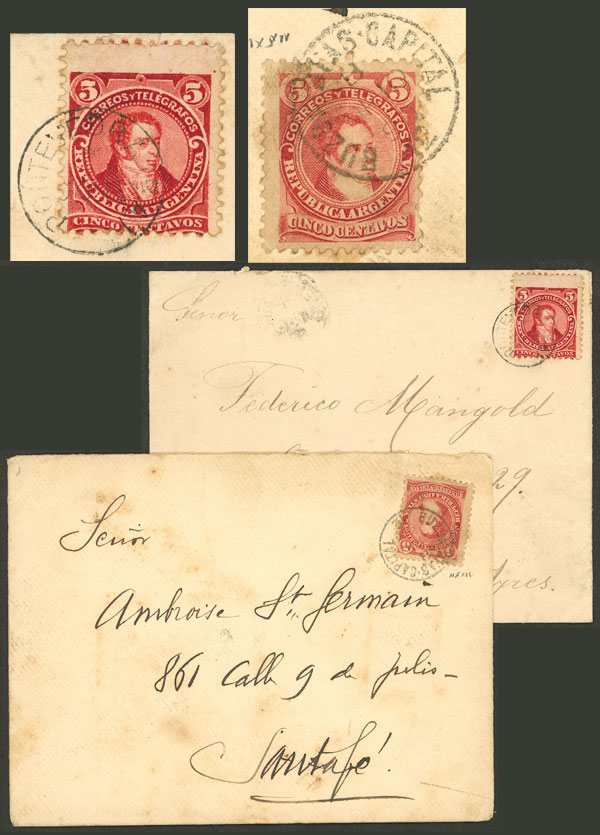 GJ.125 + 126, 5c. Rivadavia types I and II, both with COMPOUND PERFORATIONS, franking used covers (from B.Aires to Santa Fe and from Pontevedra to B.Aires), VF! (Image) (Image-02)