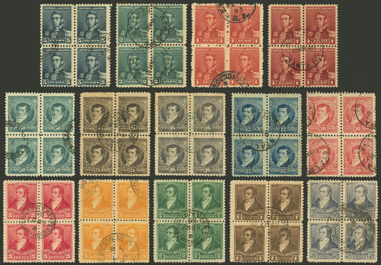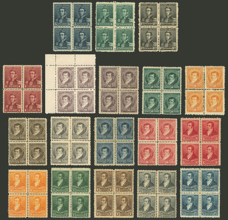 GJ.174/189 + 174A + 185A, 1896 Rivadavia Belgrano & San Martin, complete set of 16 values + ½c. slate blue and 80c. dull lilac, blocks of 4 of excellent quality, very fresh, impeccable, rare lot! (Image)