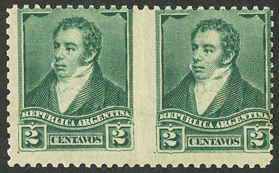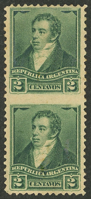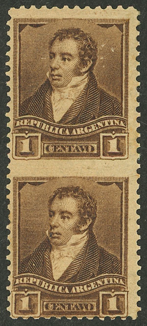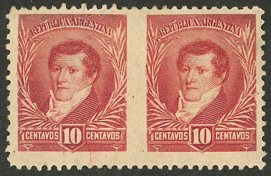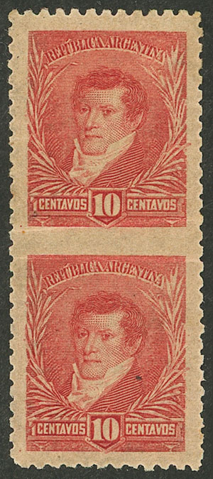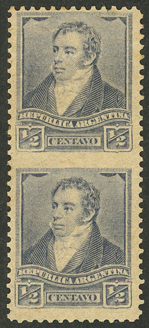 1892 10c. Belgrano, vertical pair IMPERFORATE BETWEEN, fine quality! (Image)