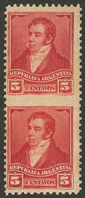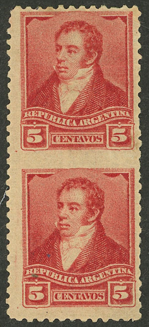 1896 5c. Rivadavia with large sun watermark, vertical pair IMPERFORATE BETWEEN, very fine quality, rare! (Image)