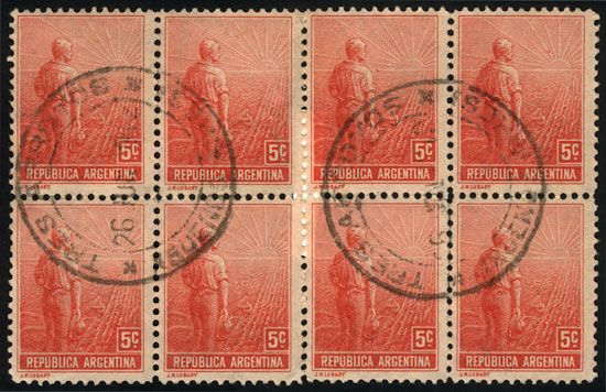 block of 8, with cancel of TRES ARROYOS (Buenos Aires), VF! (Image)