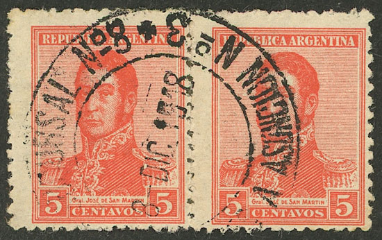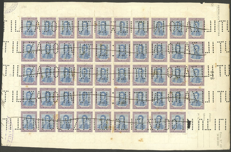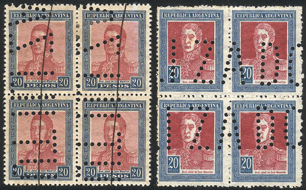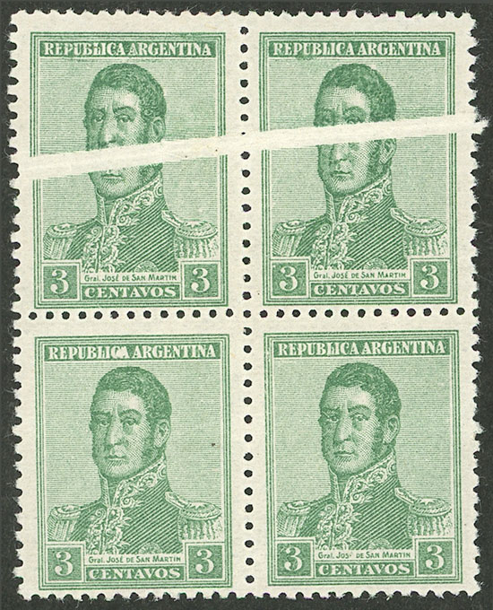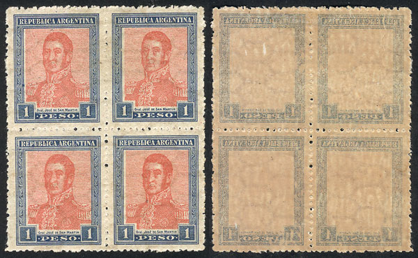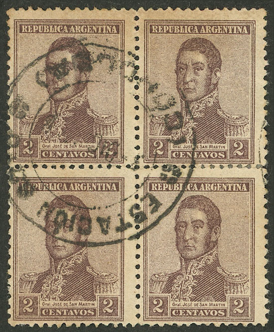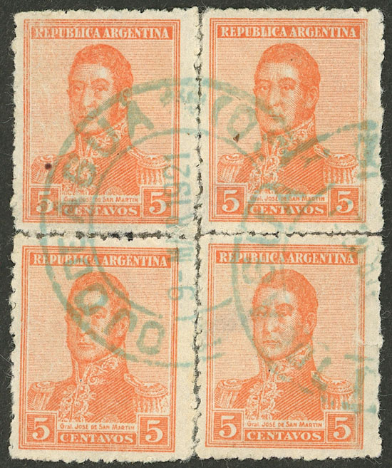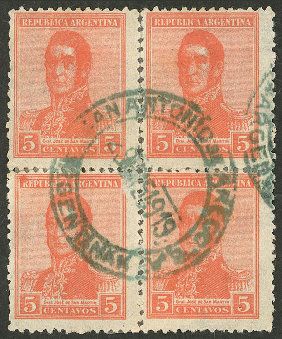 block of 4, reinforced with hinges, with postmark of "SAN ANTONIO DE ARECO" (Bs As) in greenish blue (Image)