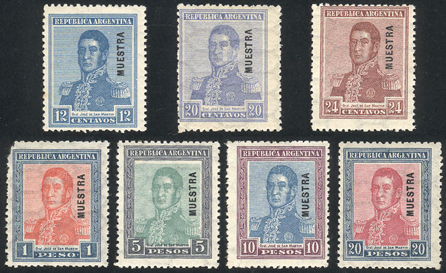 GJ.447/49 + 452/55, 7 of the high values of the set with MUESTRA ovpt., the $1 and $10 with minor faults, the rest of VF quality (Image)