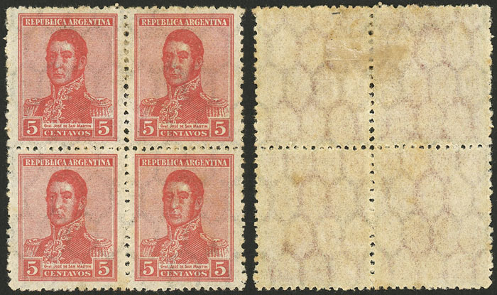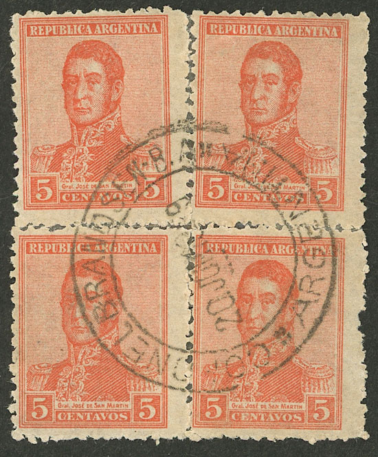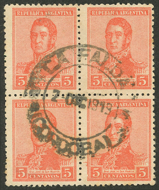 block of 4, with postmark of "LA FALDA" (Córdoba) of 2/OC/1919 (Image)