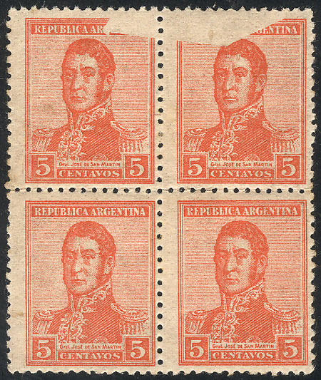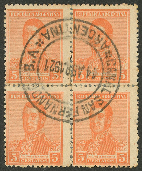 block of 4, reinforced with hinges, with postmark of "CANAL SAN FERNANDO" (Bs As) of 14/AP/1921 (Image)
