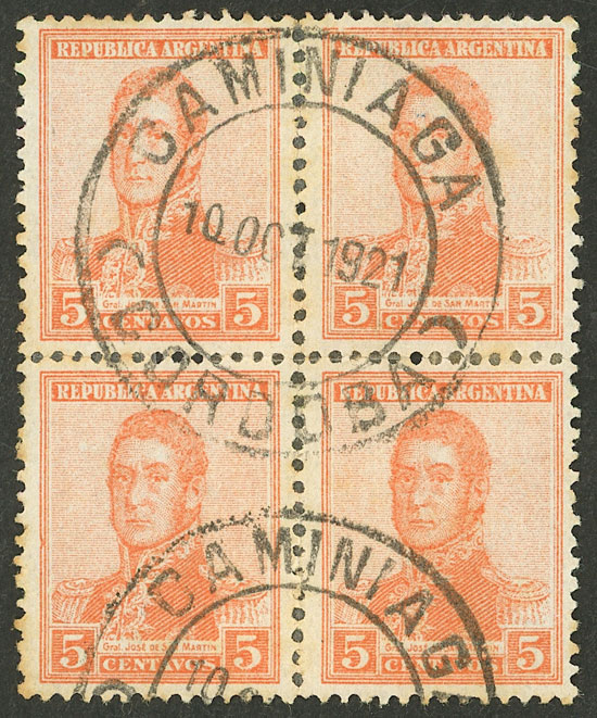 block of 4, reinforced with hinges, with postmark of "CAMINIAGA" (Córdoba) of 10/OC/1921 (Image)