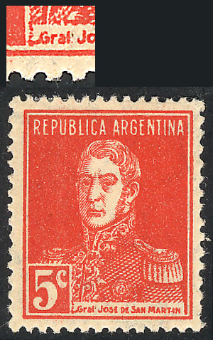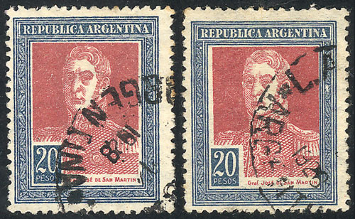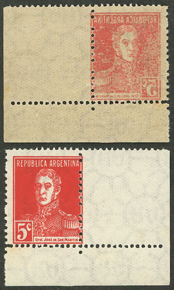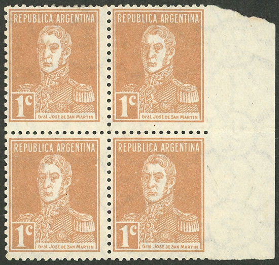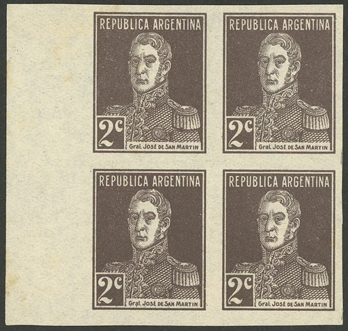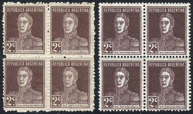 2c. San Martín w/o period, 2 blocks of 4 printed on different papers, interesting! (Image)