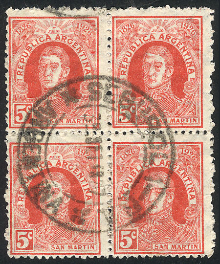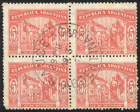 block of 4 with cancel of "SAUCE" (Corrientes), dated 29 January "19 3" (one digit in the year missing), lighly applied, VF (Image)