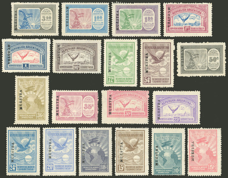 GJ.636/654, complete set of 19 values with "MUESTRA" overprint, ALL printed on ENGLISH PAPER, some (for example the high value) are very rare, others (for example the 15c, 24c, 35c, 50c and $1.26) are not even catalogued! RARE! (Image)