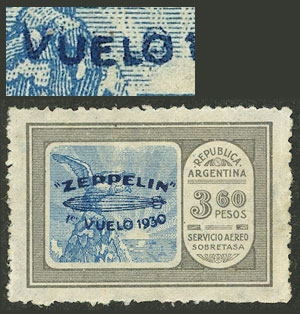 VARIETY: GJ.664, high value of the set with blue "ZEPPELIN - 1er vuelo 1930" overprint, PARTIAL DOUBLE IMPRESSION of the overprint (view the letter O in VUELO and the 3 in 1930), rare! (Image)